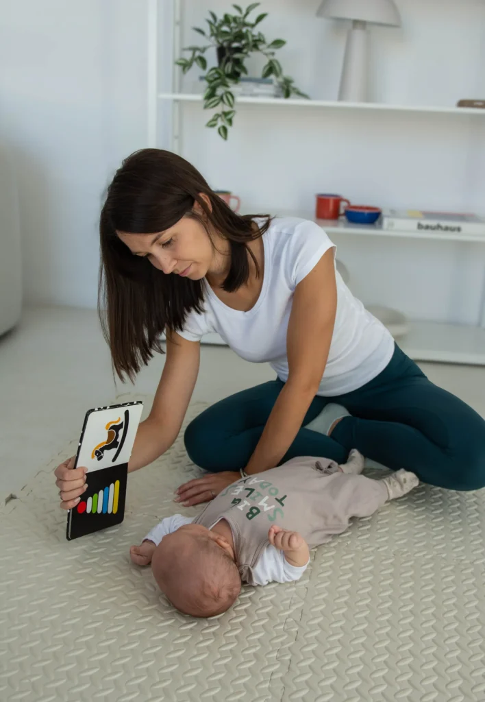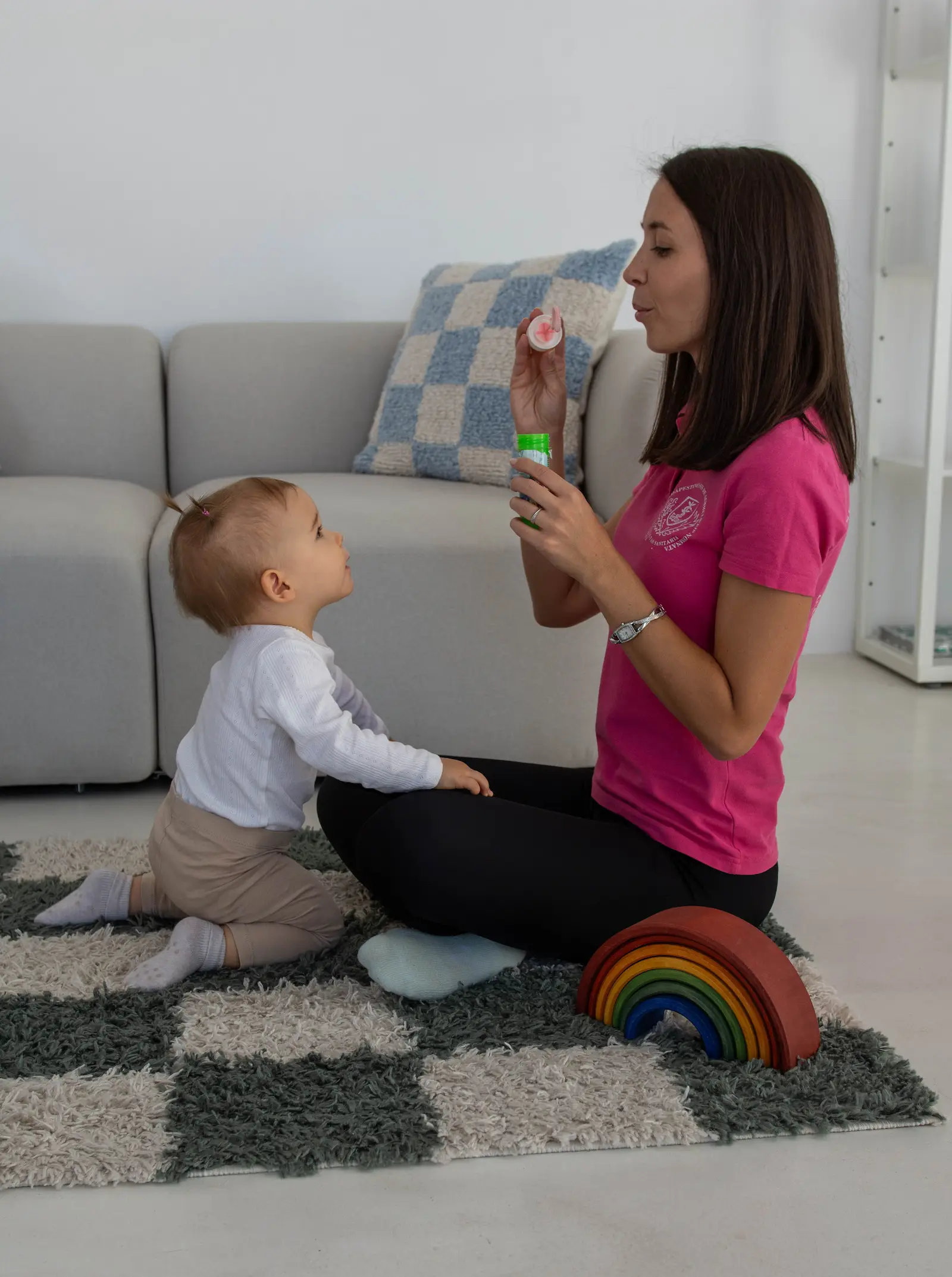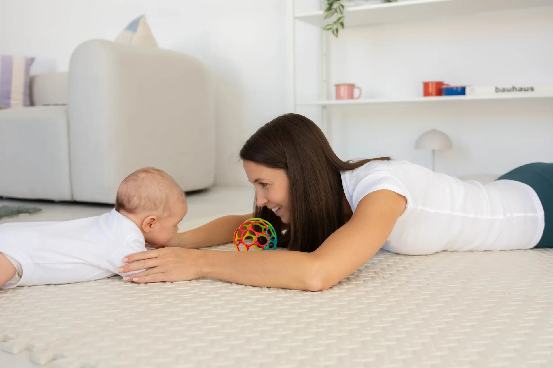 A mozgásfejlesztés úgy, ahogy a vizsgálat is, mindig játékos formában zajlik és itt is fontos, hogy a babád kényelmes ruhában legyen, olyanban, ami rugalmas, nem szűk rá, és könnyedén tud benne mozogni. Az óra elején átbeszéljük, hogy milyen változások történtek a legutóbbi alkalom óta, miben látsz fejlődést és mi az a terület vagy feladat, ami esetleg nehezebben alakul és dolgunk van még vele. A tornagyakorlatok többségét aktív feladatok teszik ki, ezt azt jelenti, hogy valamilyen játékkal igyekszem révenni a babádat arra, hogy az adott gyakorlatot saját erejéből kivitelezze. Ha ezalatt bármikor úgy látjuk, hogy elfáradt vagy nyűgös lesz, lehetőség van pihenőre vagy felveheted a karodba és megnyugtathatod. A foglalkozás végén átbeszéljük az otthon végzendő feladatokat és ha bármilyen kérdés felmerült még benned, azt is felteheted.